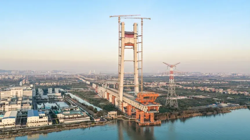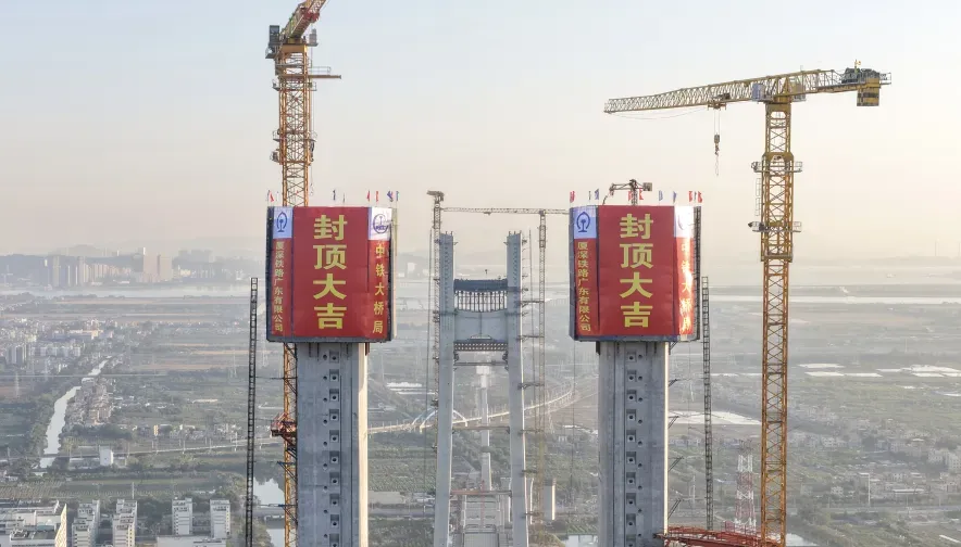 近日,深江铁路洪奇沥水道公铁大桥50号墩主塔顺利封顶。至此,这座粤港澳大湾区关键交通工程的两座主塔全部完成封顶,标志着深江铁路建设取得阶段性重大突破,迈入中跨主梁架设及斜拉索施工阶段。