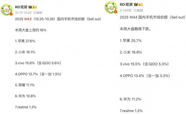 今天分享的是2025年W44(10.27-11.2)国内手机排行榜,本周大盘略微下跌,排名情况和上周保持一致,不过各大手机厂商的市场份额会有所改变。其中比较出彩的是小米手机,然后是有新机开售的一加,但是最惊艳的还是苹果,再次以25.7%的市场份额遥遥领先,国产品牌还要加把劲呀。