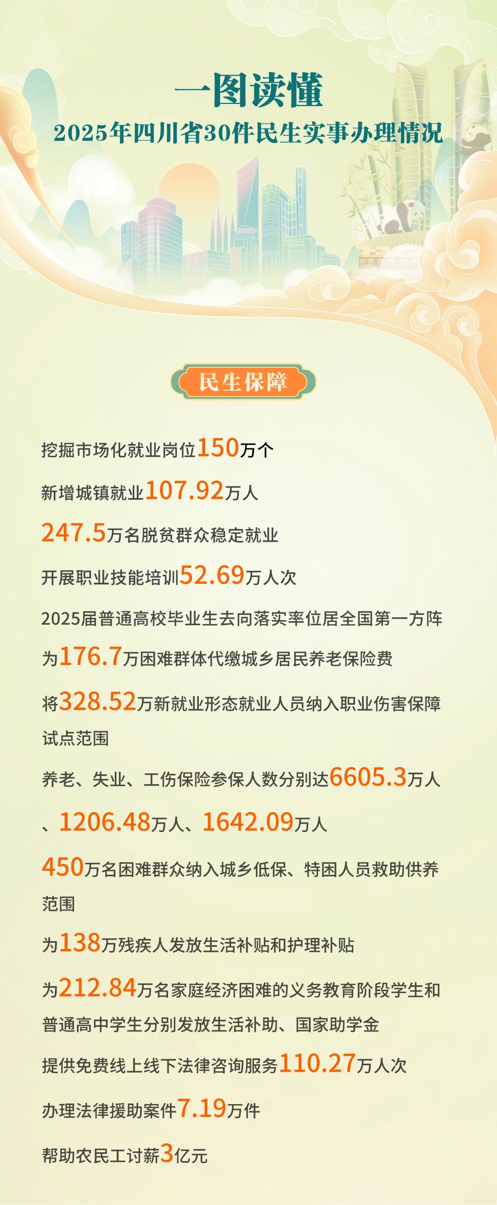 3月30日,这是记者从四川省第十四届人民代表大会常务委员会第二十六次会议上获悉的数据。今年,省人大常委会首次听取和审议年度民生实事完成情况。按照有关法律法规和省人大常委会安排,受省政府委托,省人民政府秘书长胡元坤在会上报告了2025年度全省30件民生实事工作情况。
