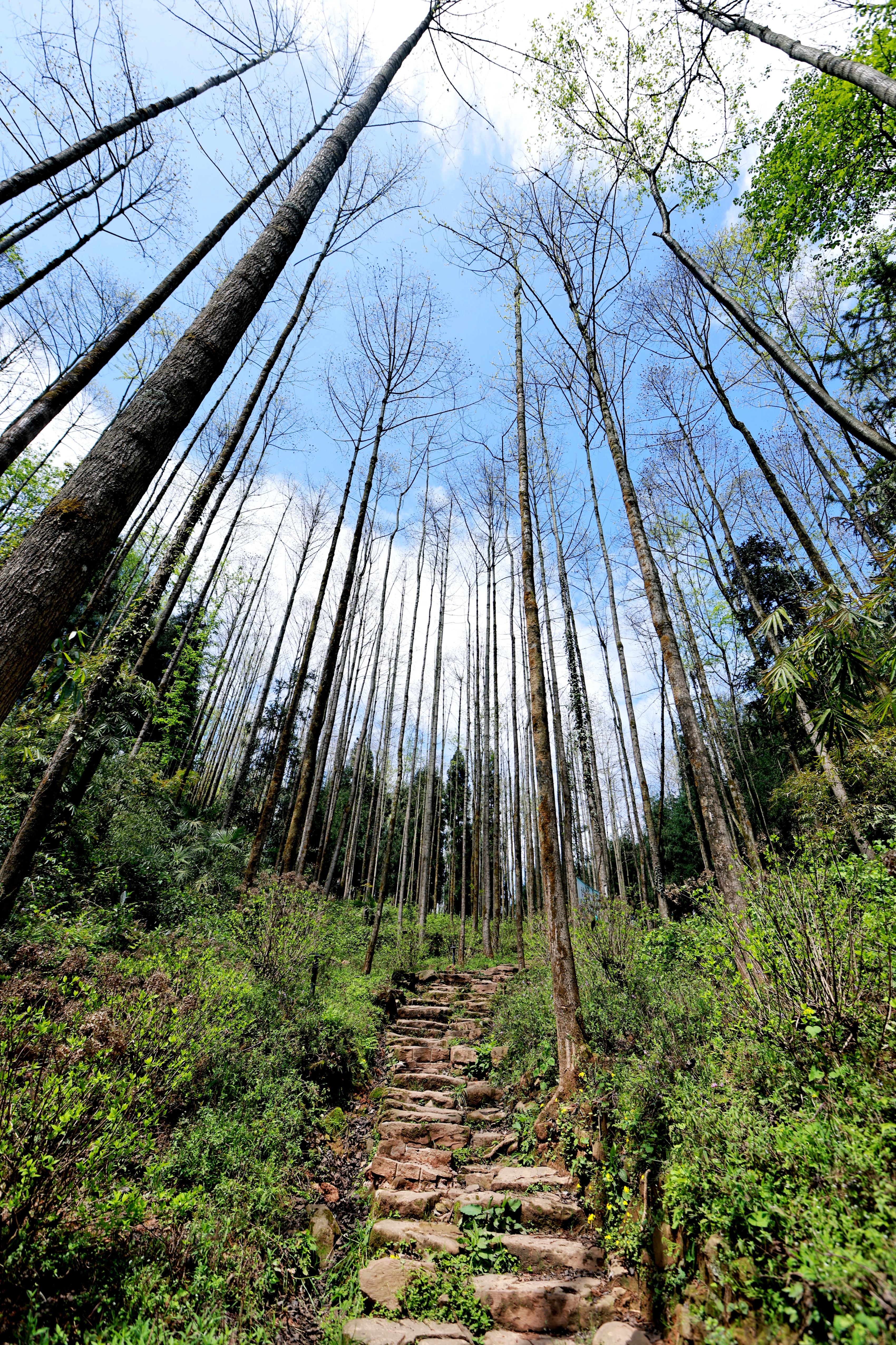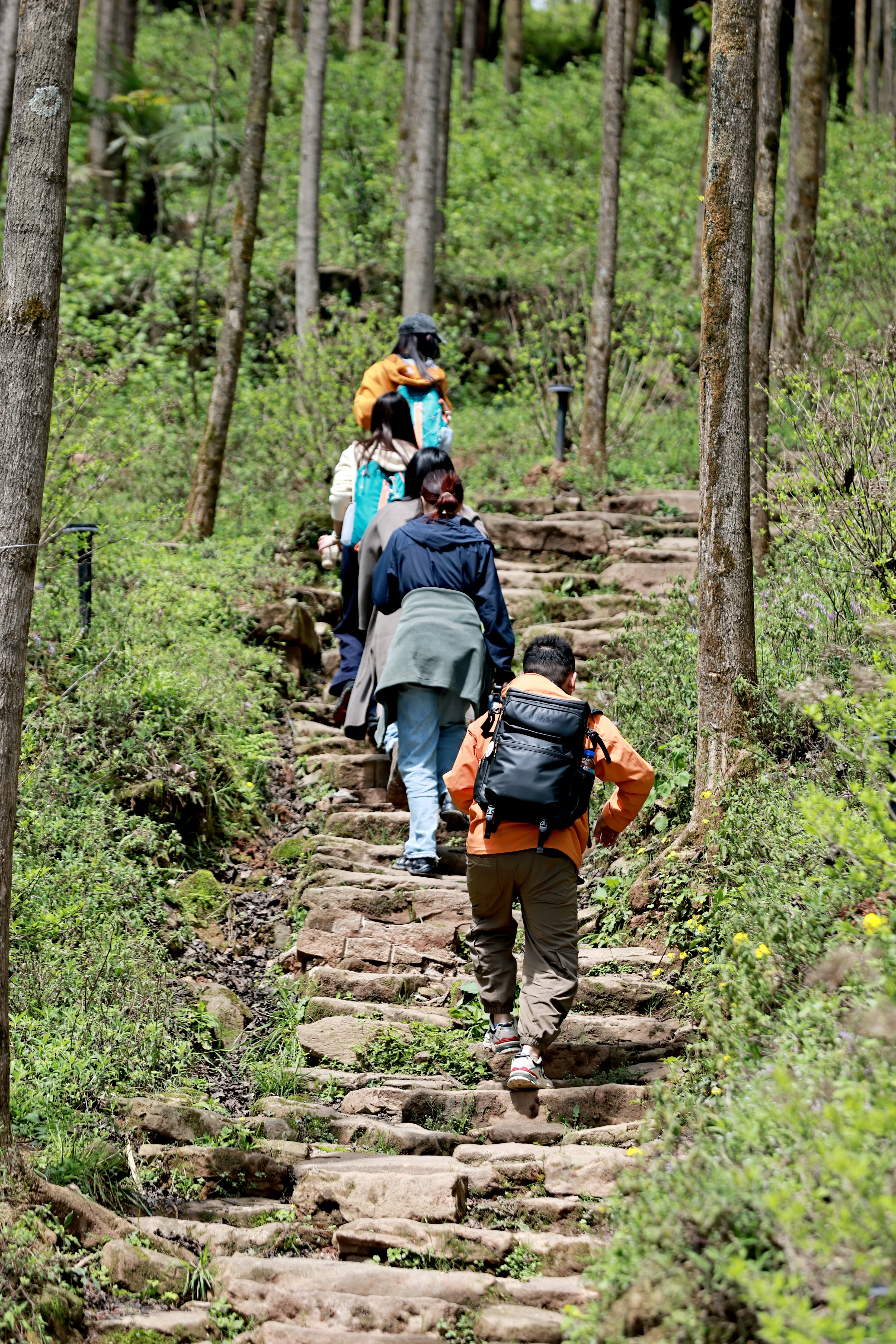 10位达人攀登阶梯,沿着步道前行。沿途的景致也发生变化,放眼望去几乎都是成片的高耸竹林和山树,成群的黄色白色野花散落在山间。在幽静的山林里,虫鸣声也显得格外明显。