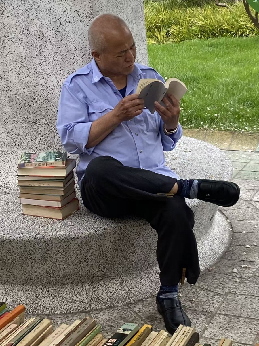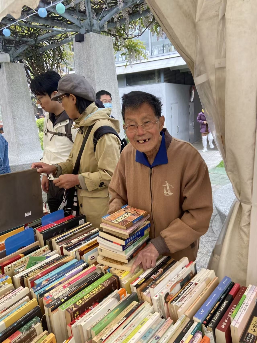 93岁陈先生家住常德路,是上海旧书店与“淘书乐”常客,退休前是建筑设计师。一大早来赶集,脑子清爽,话语清晰,他说这得益于自己的兴趣爱好,那就是一辈子喜欢阅读。他看书买书比较杂,文史、风水、棋牌等旧书纳入囊中,十多本旧书里还有外文书,他有时借助辞典还能阅读外国小说。